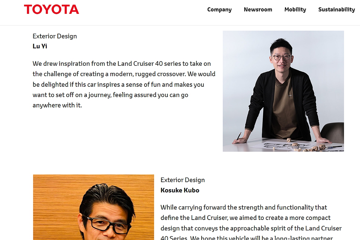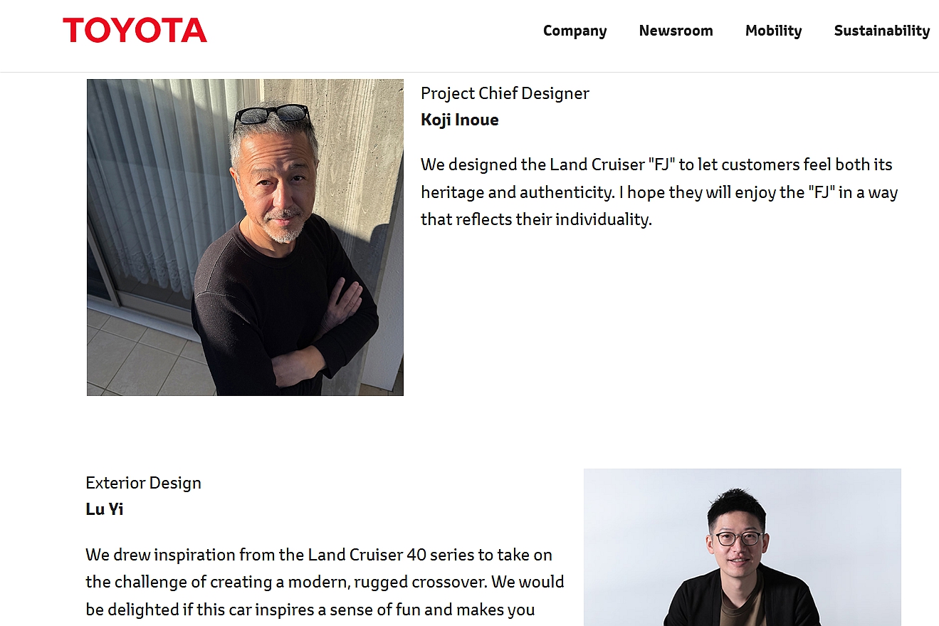 實際上日本Toyota汽車於Land Cruiser FJ發表之際同步公開設計草圖的相關資訊中,Toyota Land Cruiser FJ專案總設計師,是由曾擔任bZ4X車內設計總監的井上浩司負責,而光是外觀設計就有多達5名設計師參與。