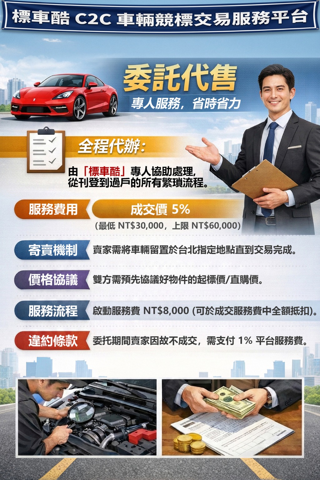 適合: 公事繁忙,想把拍照、諮詢、過戶等專業過程交給團隊處理的車主。 費用: 5% 成交服務費(最低三萬,上限六萬)。