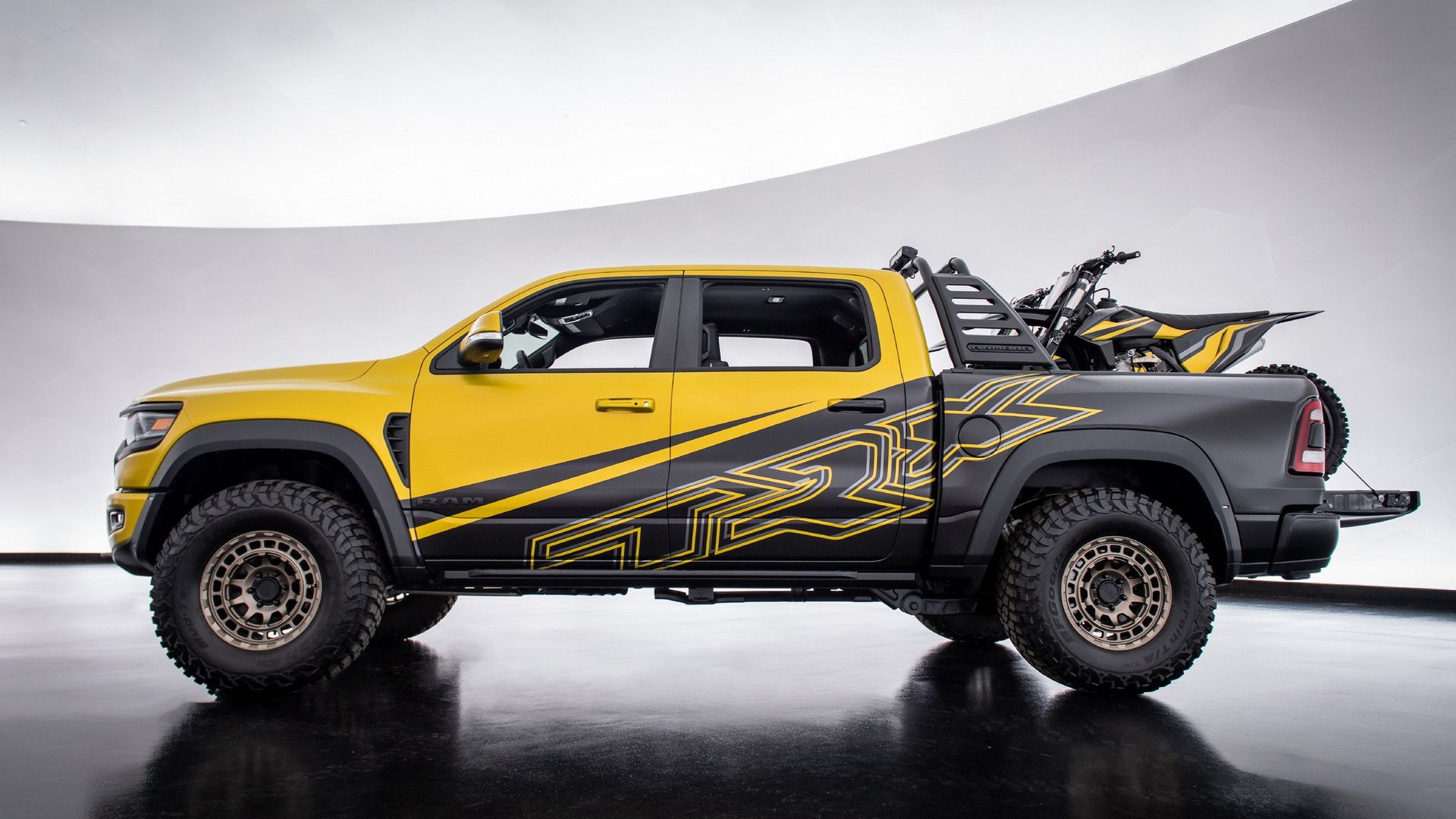 在外觀設計上,RAM 1500 Gold Shot 用上了全車黃黑相間的消光車身塗裝樣式,腳下則搭配客製化的 Vintage Bronze 18吋 Black Rhino Chamber 雙片式輪轂,再搭配後斗上具有浮誇造型的防滾架及兩顆高功率探照燈的加持下,營造出經典美式越野皮卡極為硬派的氛圍感。