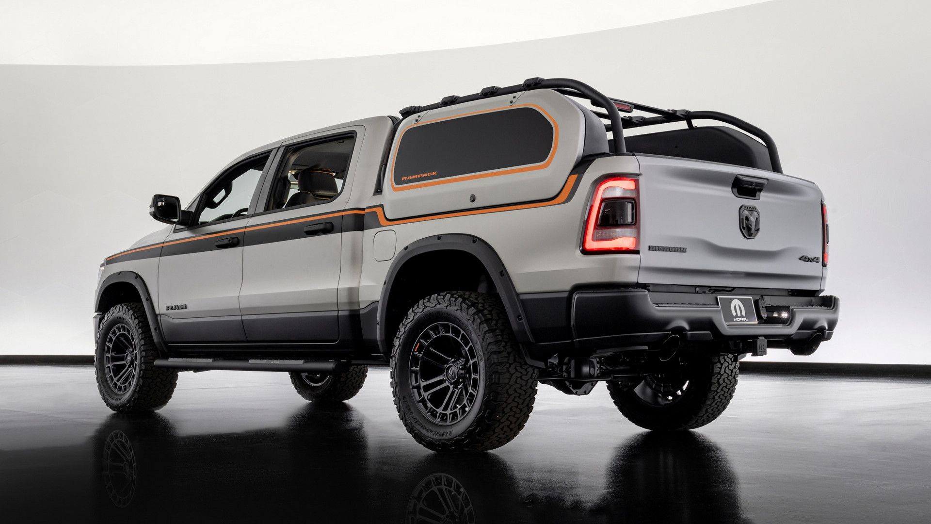 而原廠則為 RAM 1500 Backcountry X 搭配了消光鈦色、黑色相間的塗裝樣式,並以橘色元素來加以點綴,同時也導入了20吋消光黑越野輪轂,並且配置 FOX 減震器、以及 2 英吋的升舉套件來強化這輛車在越野方面更多的可能性。