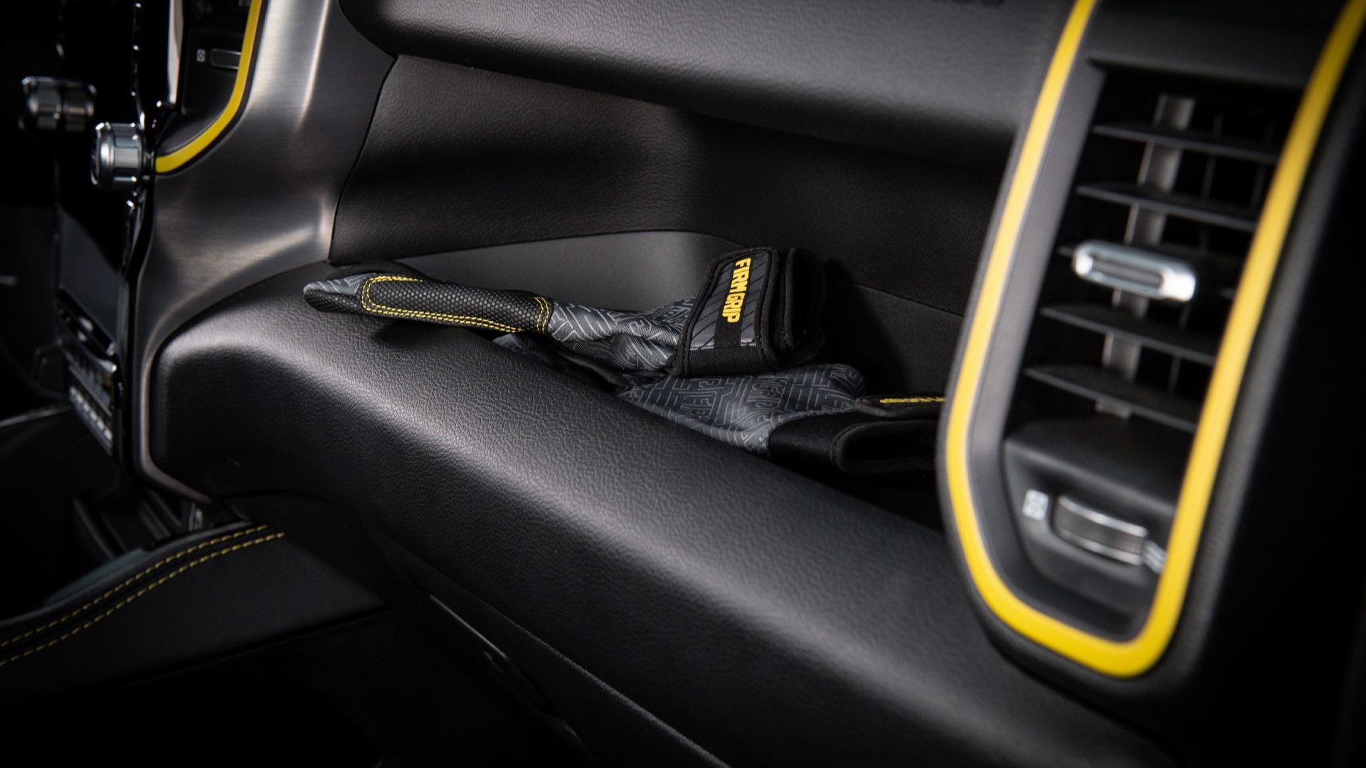 打開車門後,可以看見 RAM 1500 Gold Shot 的內飾在配色上的設計與外觀相呼應,同時原廠也為這輛車搭配了兩張由 Capri 皮革 與 Alcantara 材質所包覆的運動化的跑車座椅,並且加入 Alaska Gold 黃色車縫線來加以點綴,提升整個車內的熱血風格。
