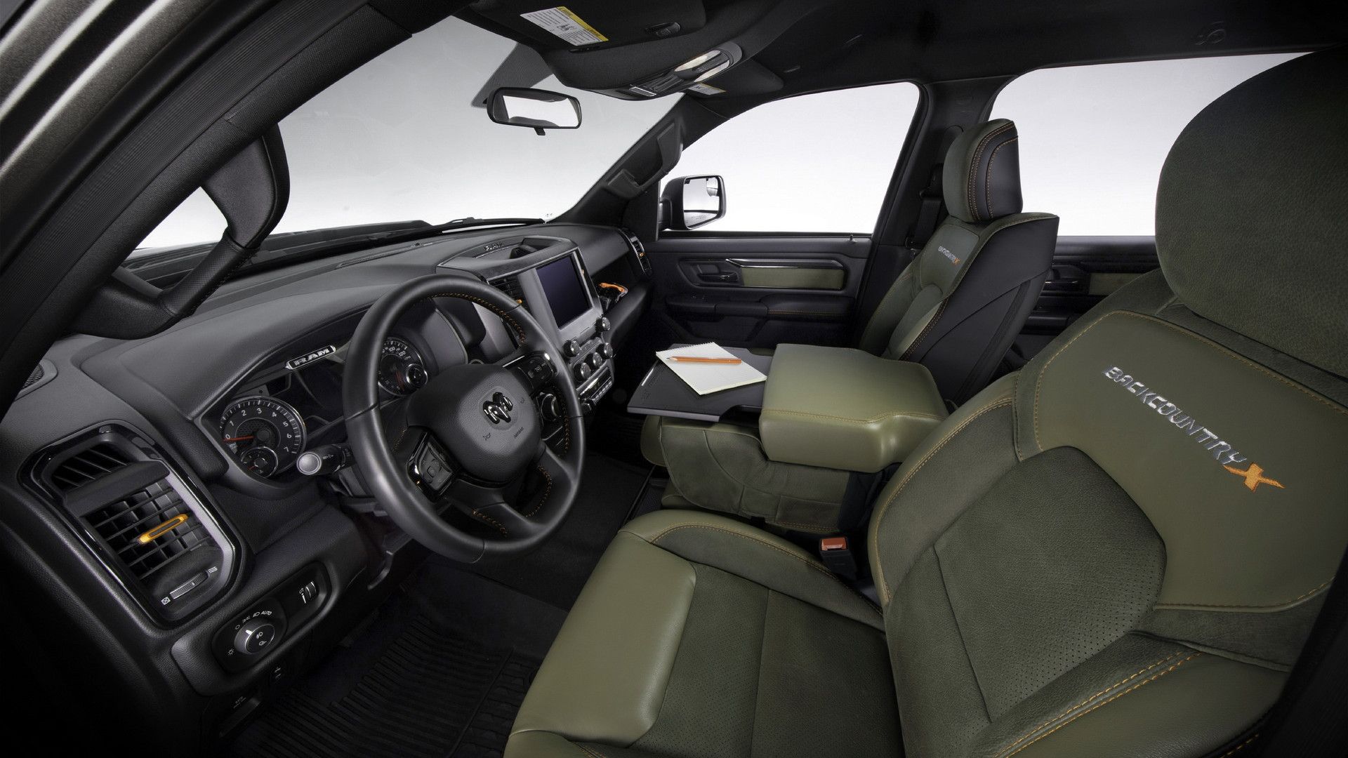 至於 RAM 1500 Backcountry X 的內飾空間則以黑色與軍綠來鋪陳,並搭配些許橘色元素 (包含車縫線) 來加以點綴,而且在車內的用料上也不因其是一輛越野皮卡而有絲毫馬虎,不僅車門輔助把手使用了 Gore-Tex 材質,這輛車也採用了 Mopar 專屬的全季節地墊來讓車主更好地維護車內的整潔。