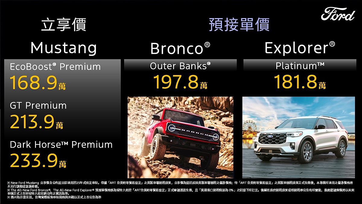 另一方面,Ford揭露首波導入熱銷全球市場的The All-New Ford Bronco® Outer Banks®與The All-New Ford Explorer® PlatinumTM,顯示其未來美製車導入台灣市場的戰略布局野心,並同步啟動預接作業。本次同步公布預接單參考價,其中The All-New Ford Bronco® Outer Banks®為197.8萬元、The All-New Ford Explorer® Platinum™為181.8萬元;前述價格係以零關稅條件提前進行試算,作為未來導入的重要參考基準。