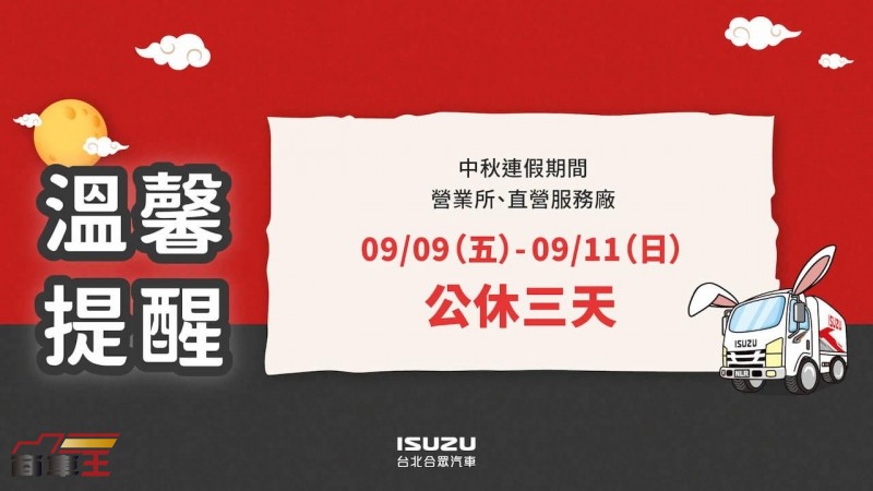 台北合眾汽車也提醒消費者,因 9/9~9/11 適逢中秋連續假日,因此全國營業所及直營服務廠均會公休 3 日。此外,原訂於上週末 9/3 於國立台灣博物館舉辦的 「博物館闖關趣,生態保育週」活動,因天候因素而延期,日後將另行公布舉辦日期。