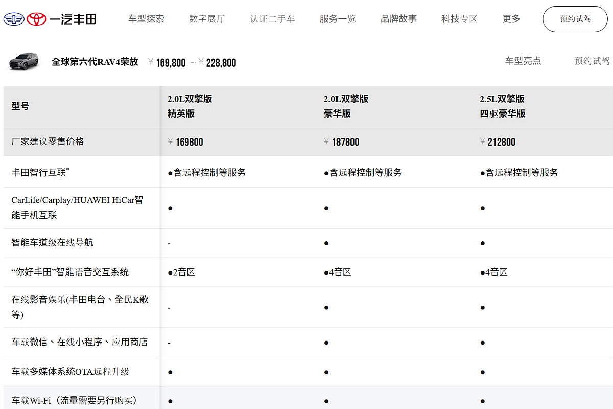 一汽豐田Rav4榮放將2.0L HEV FWD列為入門車型