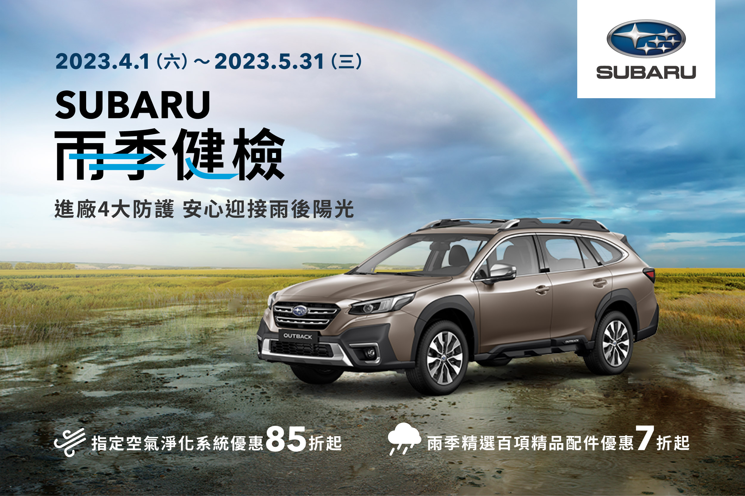 梅雨季節即將到來,SUBARU關心每一位車主的行車安全,除了溫馨提醒所有車主留意愛車狀況,確保梅雨季期間的行車安全之外,更為車主貼心推出「SUBARU雨季健檢」活動,自4月1日起至5月31日止,凡預約回廠將提供包含煞車、輪胎、引擎室、車電等全車四大系統共20項免費健檢,並可享車艙內部去霉除臭服務及原廠零配件優惠禮遇,單筆消費滿8,800元起再贈實用的雨季必備滿額好禮。SUBARU誠摯邀請車主提前預約回廠,透過SUBARU專業技師團隊提供專業且完善的檢查,維持您的愛車常保最佳車況,安心迎接雨後陽光!