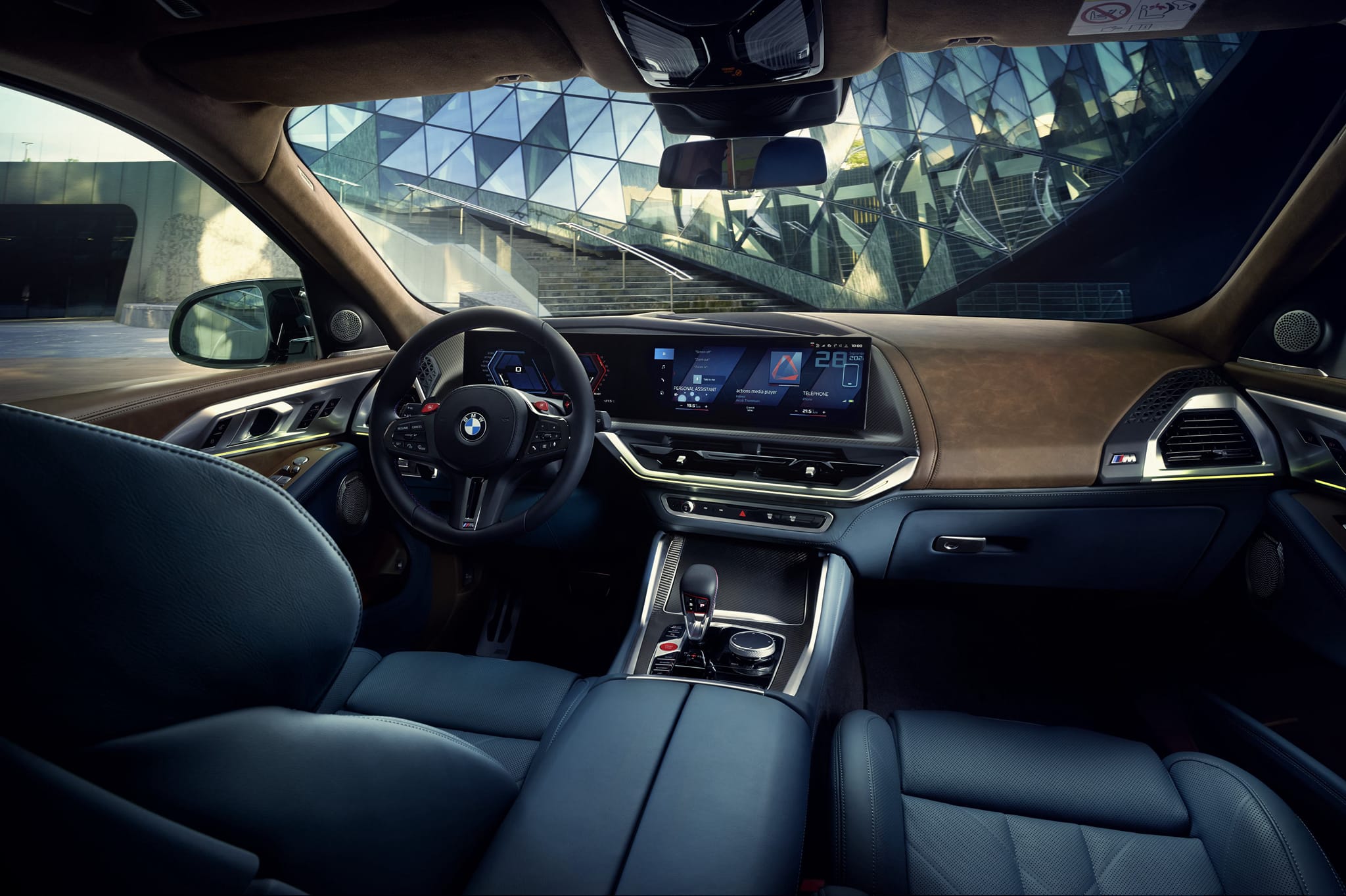 全新一體式曲面螢幕將12.3吋虛擬數位儀錶與14.9吋中控觸控螢幕完美嵌合於消光碳纖維飾板上,搭配BMW iDrive 8.0使用者介面,更直覺的操作BMW Personal CoPilot智慧駕駛輔助科技、AR擴增實境導航及360度環景輔助攝影等功能。M車況抬頭顯示器以專屬M介面即時顯示路況及換檔指示等資訊,讓駕駛無論是在城市道路或專業賽道上皆能全心投入每一次的操駕樂趣