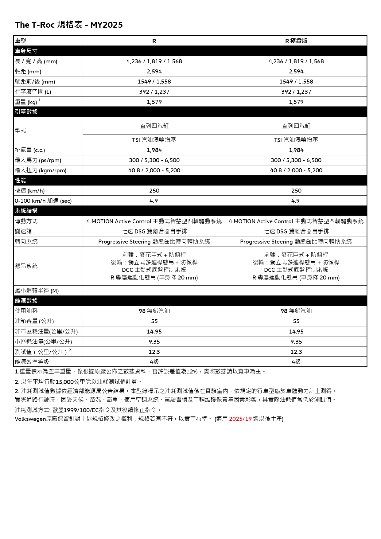 – The new T-Roc R極緻版擁強大動力配置,發揮最大馬力300ps、最大扭力40.8kgm和零百加速僅4.9秒的驚人實力,且以DCC 主動式底盤控制系統以及R 專屬運動化懸吊(車身降 20 mm)賦予一流操控。