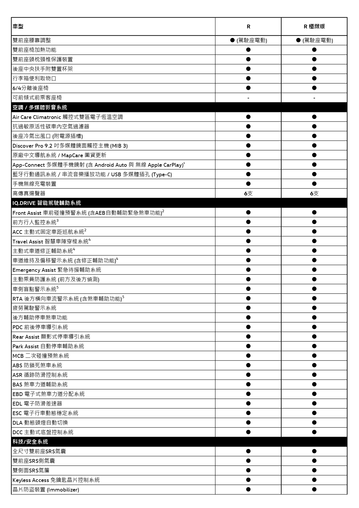 作為令人安心的可靠後盾,The new T-Roc R極緻版具有豐富的主被動安全科技和完善的IQ.DRIVE 智能駕駛輔助系統:Travel Assist 智慧車陣穿梭系統整合全速域 ACC 主動式固定車距巡航系統、車道維持及偏移警示系統(含修正輔助功能)和主動式車道修正輔助系統,有效減輕駕駛負擔,配合主動乘員防護系統(前方及後方偵測)、Front Assist 車前碰撞預警系統(含AEB自動輔助緊急煞車功能)、車側盲點警示系統、RTA後方橫向車流警示系統(含煞車輔助功能)、MCB二次碰撞預煞系統與6具SRS安全輔助氣囊,全方位守護每次無憂的平安出行。