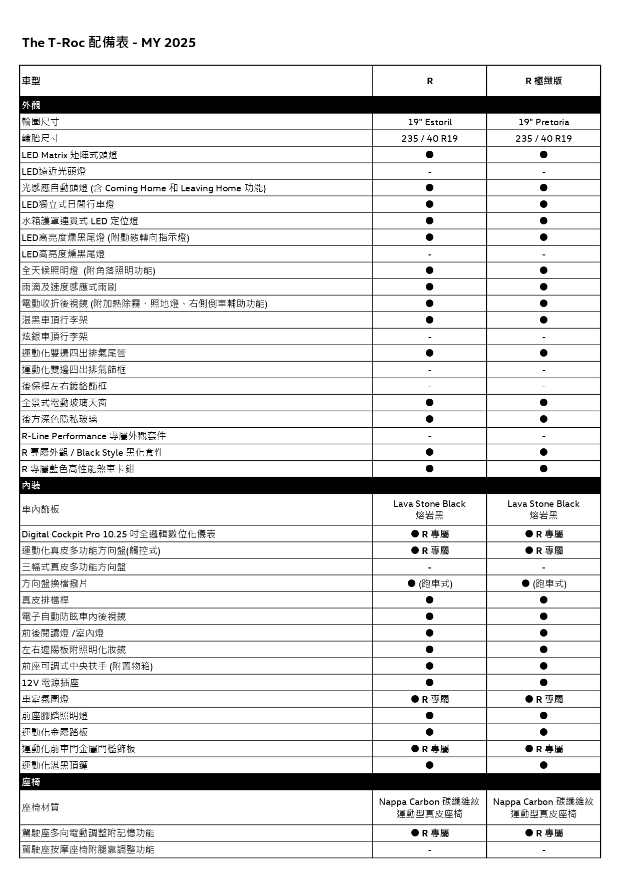 The new T-Roc R極緻版車室空間不僅科技智慧,更延續不滅熱血精神,駕駛座映入眼簾的是Digital Cockpit Pro 10.25 吋全邏輯數位化儀表、運動化真皮多功能方向盤(觸控式)含方向盤換檔撥片(跑車式)以及運動化內裝:運動化金屬踏板、R專屬運動化前車門金屬門檻飾板和運動化湛黑頂篷,配備的Nappa Carbon 碳纖維紋運動型真皮座椅具有R專屬駕駛座多向電動調整附記憶功能,雙前座椅皆可調整腰靠、加熱並且擁有頭枕頸椎保護裝置,此外,能一覽遼闊藍天的全景式電動玻璃天窗、依照乘員需求可獨立調整的Air Care Climatronic 觸控式雙區電子恆溫空調、無縫串聯行動裝置的App-Connect 多媒體手機鏡射 (含 Android Auto 與 無線 Apple CarPlay)與手機無線充電裝置無一不悉心營造便利且舒適的乘坐感受。