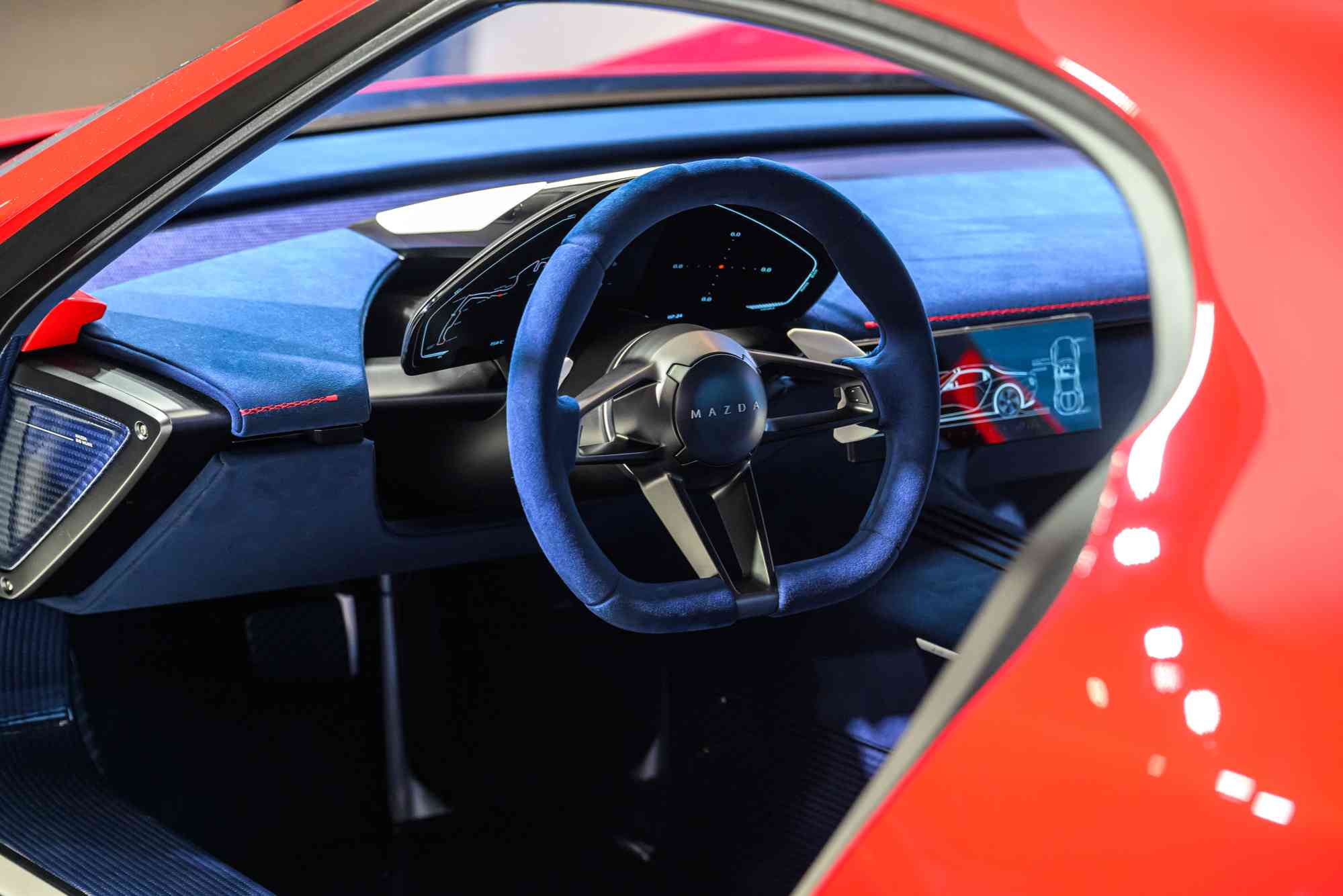 這份對細節的講究,也落實於 MAZDA ICONIC SP 的座艙設計,以「駕駛中心軸」為發展核心,從座椅位置、視野配置、車身高度到輪胎規格,皆依循駕駛視角整體規劃,結合下傾式儀錶介面,有效降低外部光線反射對資訊閱讀的干擾,營造專注而沉浸的座艙氛圍,讓駕駛能全然投入操控之中。