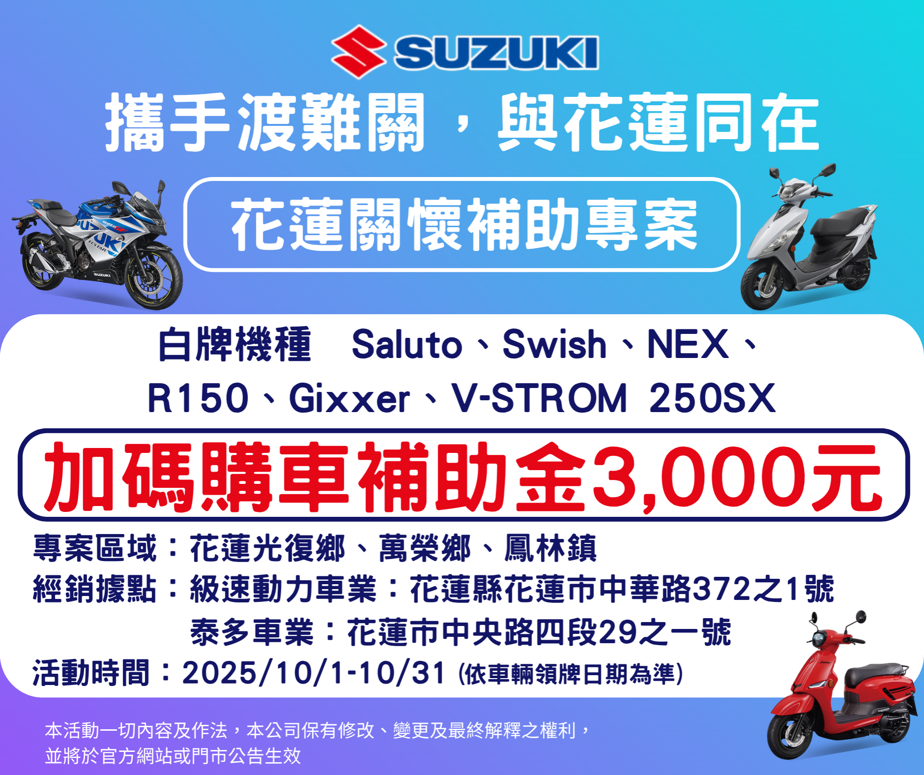 受到近期花蓮地區洪災影響,許多民眾的交通工具受損、生活受到衝擊。為了協助當地居民度過難關,SUZUKI機車宣布啟動「花蓮關懷補助專案」,希望以實際行動陪伴鄉親重建生活。