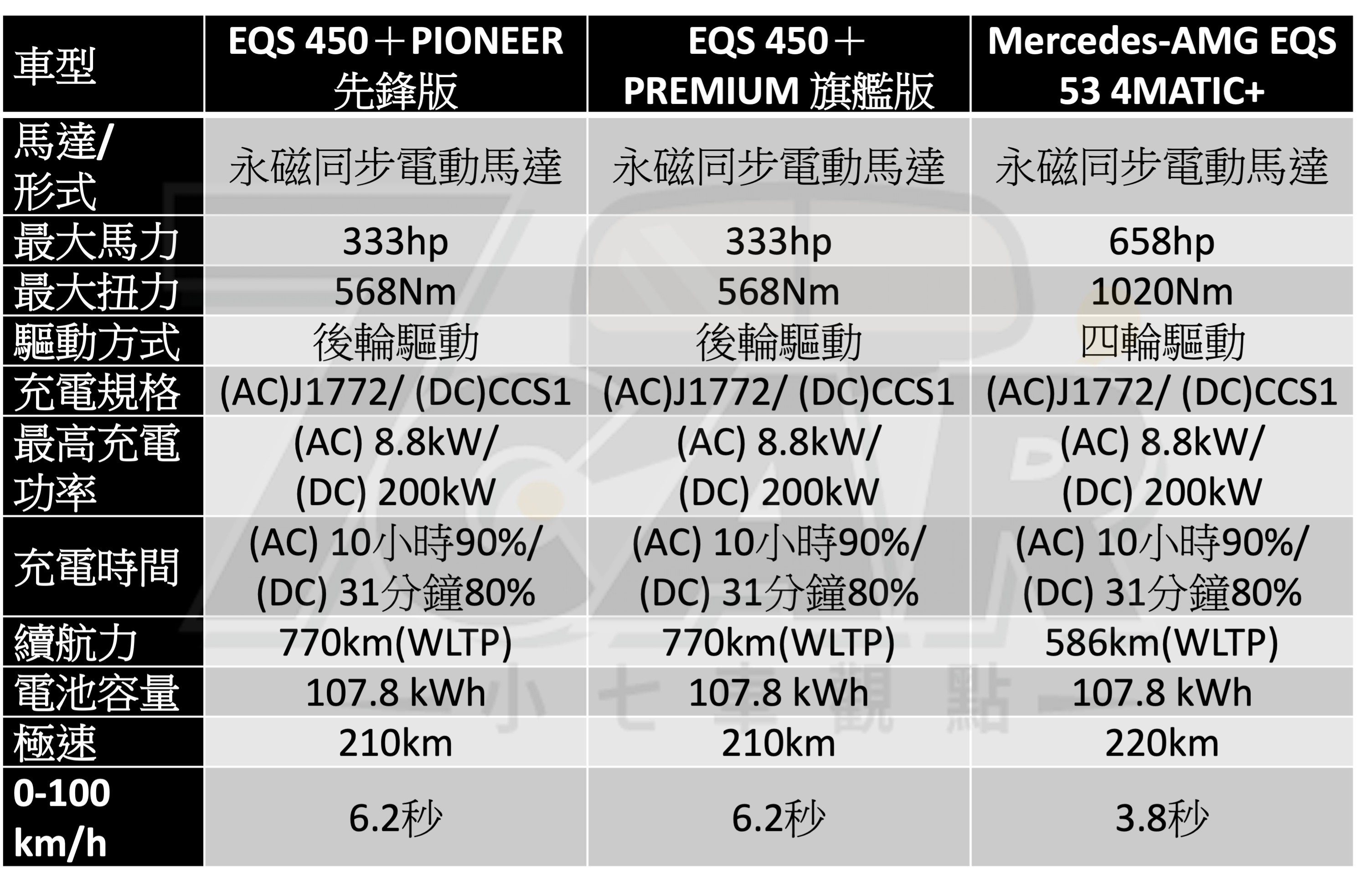 EQS 450+ 的動力來自一具置於後軸的永磁同步馬達,最高輸出 333hp,原廠宣稱 0~100 km/h 加速來到 6.2 秒,而在 107.8 kWh 電池組加持下,最高續航里程可達 770km(WLTP 規範),此外,並標配全氣壓懸吊及後軸轉向系統,也具備四段動能回收調整模式。