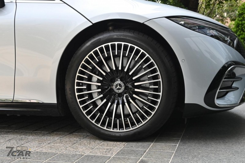 EQS 53 展示車型選配 AMG 跨幅式亮黑鋁圈,尺碼仍為 275/40 R21。