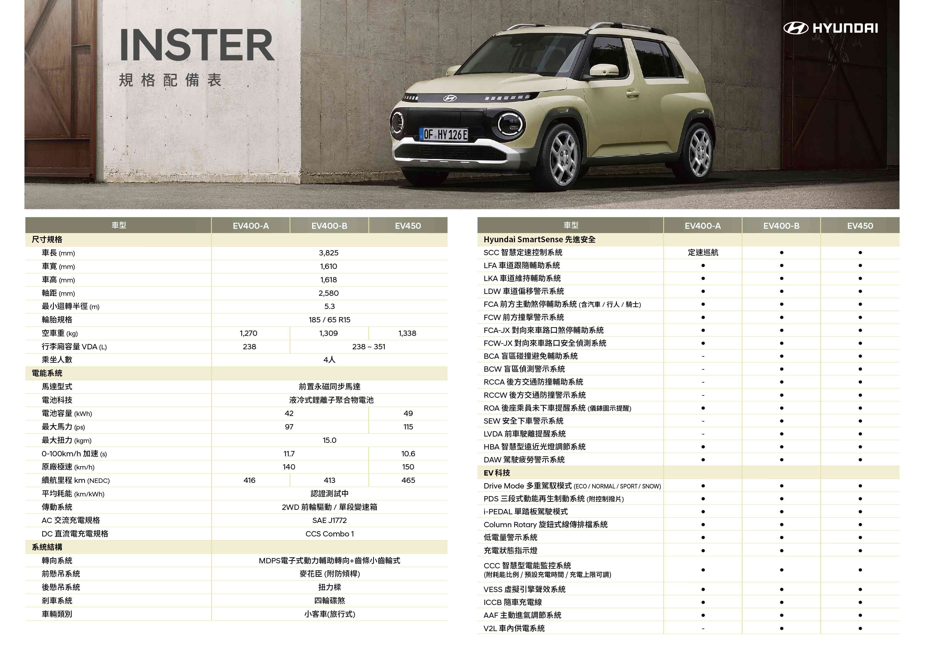 作為A-segment級距唯一的純電動力車型,INSTER不僅代表Hyundai汽車在小型電動車市場的創新突破,更重新定義都會駕馭的輕盈與樂趣。INSTER提供兩種電池容量選擇,滿足不同用車型態需求。標準版搭載42kWh鋰離子聚合物電池,擁有最高416公里(NEDC)續航里程,且每度電可達8.3km的優異能源效率,以靈巧、輕盈為特點,完美對應每日通勤與都會移動;而長續航版則升級為49kWh電池組,可達465公里(NEDC)續航表現,讓駕駛能更自在地享受城市與郊區之間的純電旅程。兩款車型皆支援最高120kW直流快充,僅需30分鐘即可完成10–80%充電,同時配備三段式動能回收系統與i-Pedal單踏板駕馭模式,結合安靜、平順與高效的特質,讓駕馭不僅環保,更充滿輕鬆愉悅的節奏。