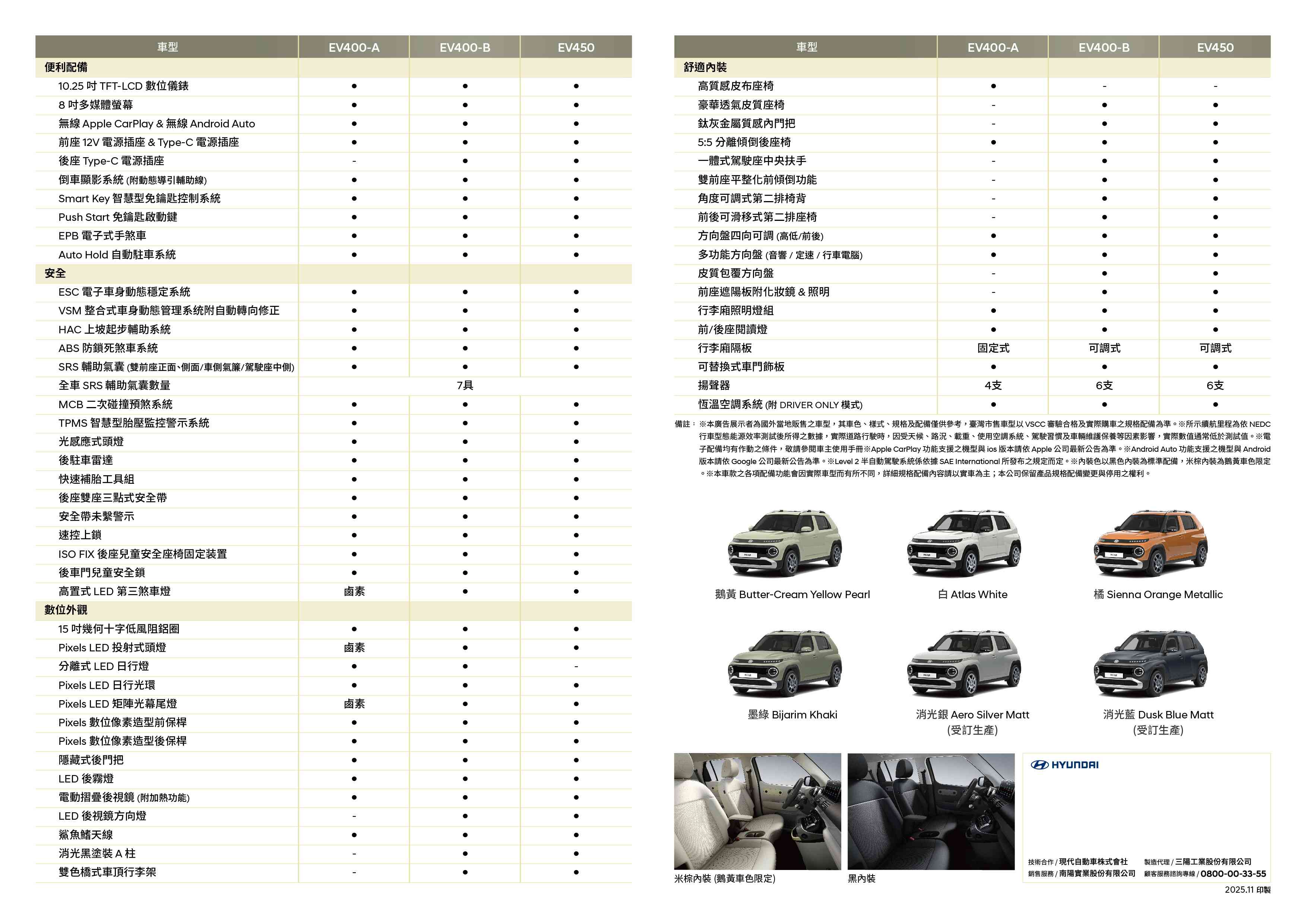 同時,INSTER配備多項電動車專屬便利科技,包括可於車內使用的V2L供電功能,滿足筆電充電、露營照明或咖啡機等行動生活需求,真正實現「車即是行動電源」。不論是日常通勤、郊外野餐或臨時辦公,INSTER都能提供靈活便利的電能體驗,讓科技更貼近生活。安全配備上,全車系標配Hyundai SmartSense 主動安全科技,包含Level 2 ADAS智慧駕駛輔助系統、7具SRS輔助氣囊、智慧型主動車距維持、全速域車道維持輔助、盲區碰撞避免與後方交通防撞等完整防護。即使是第一次開電動車,也能擁有滿滿安全感。