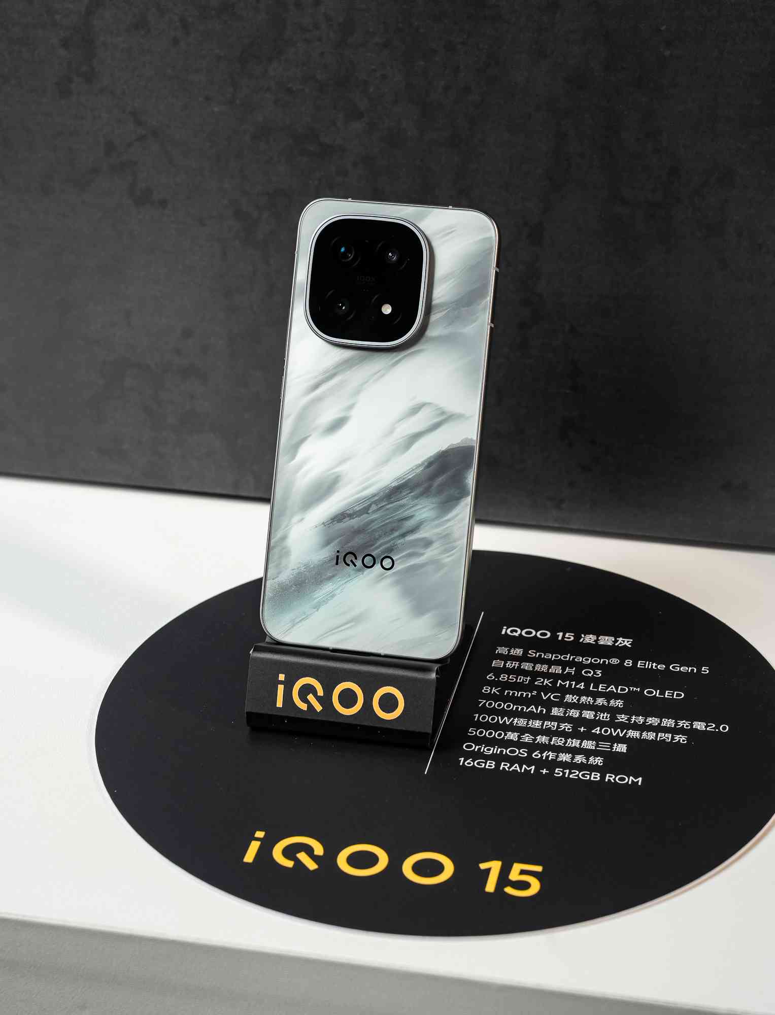 iQOO 15 具備了讓電競玩家眼睛一亮的六大亮點,包括強強聯手Monster超核引擎的不掉幀、7000mAh藍海電池的強續航、8K mm² VC散熱系統的不發熱、機身與螢幕光效同步迸發的懸浮能量光環、MAX 雙軸震感馬達的4D遊戲震感及支援最高2K 60幀 20Mbps的流暢直播,帶給電競玩家最佳遊戲體驗。搭配5000萬畫素Sony 3倍潛望長焦鏡頭、OriginOS 6作業系統及貼心售後服務,為效能控、遊戲玩家和創作者等帶來更高水平使用體驗!iQOO 15 推出16GB RAM+ 512GB ROM,並打造兩款外觀配色,「凌雲灰」展現無限凌雲氣勢,「傳奇白」則以競速菱格紋設計彰顯速度美學。即日起至12月5日,凡於指定通路預購iQOO 15,至官網登錄完成即可獲得超人氣Razer Kishi Ultra 遊戲手持裝置;預購期間持ASUS ROG手機至全台官方體驗店賞機並完成預購iQOO 15,加碼再送vivo筆電隨行袋乙個!