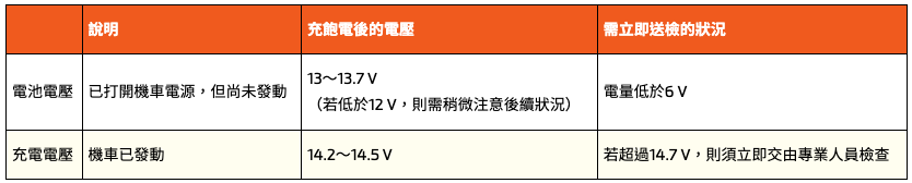 下表教你從電瓶的電壓來檢測機車是否沒電: