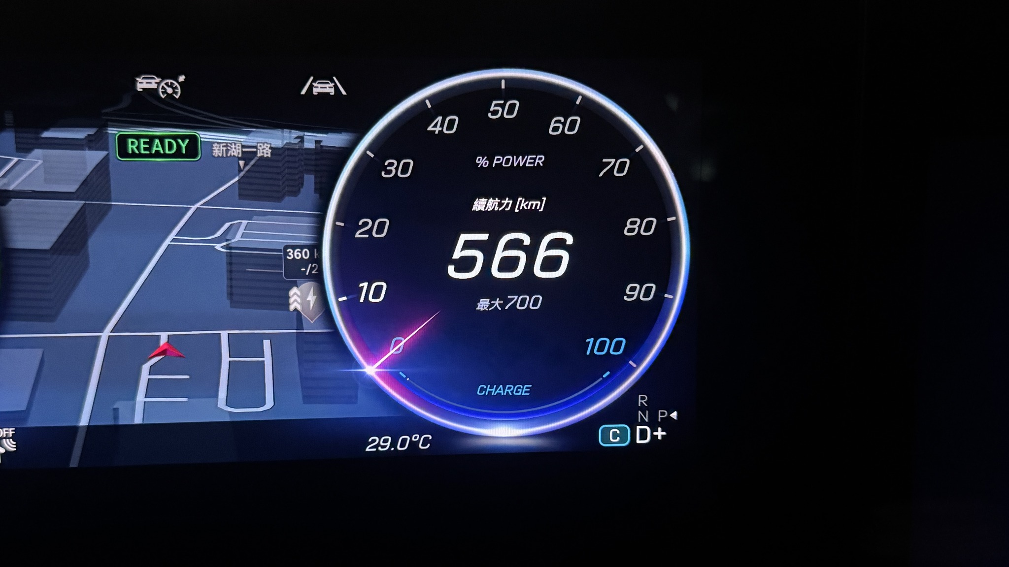 5 電池充電100%充飽後,車上螢幕顯示續航力為566km,最大700km。 這兩個數字的差異是,566km是根據我這幾天的駕駛習慣,換算出續航力約莫566km,700km是告訴你,如果在最節能的開法下,包含電門踩踏,冷氣大小,行駛路面狀況,包含回充的設定等,在最佳狀態下,可以行駛到700km。給各位參考!