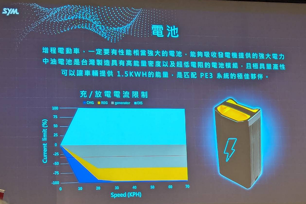 這樣架構設計下,使Sym三陽PE3增程式電動機車具備電池容量從100%消耗至40%的35公里純電續航力。目前電池電量設定在40%就會啟動燃油引擎發電,然後再搭配3公升油箱下使車輛最大續航里程達到325公里遠。