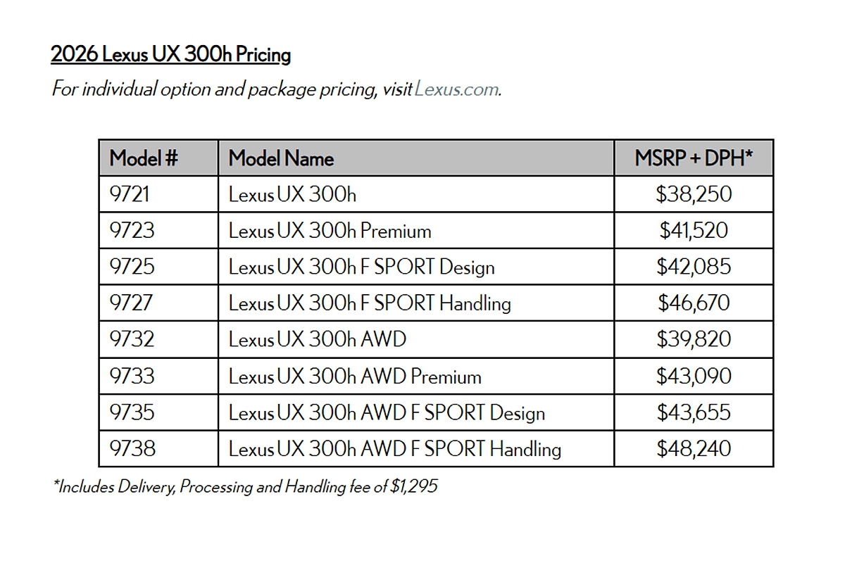 美國Lexus分公司宣布推出2026年式UX 300h並提供多達八種銷售車型可選,基礎售價自38,250美元起、約新台幣120萬元;最貴車型UX 300h AWD F SPORT Handling則要價48,240美元、約新台幣152萬元。