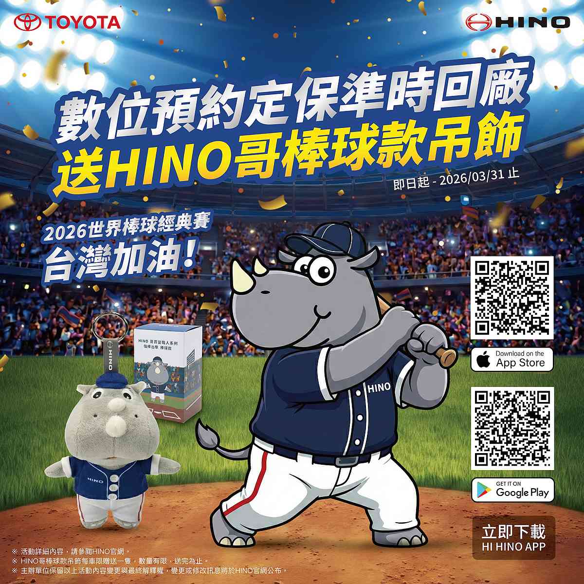 為了提升顧客預約回廠的便利性,今年HI HINO APP 功能全面升級,預約資訊更透明且操作更容易,2026年3月31日前使用數位預約定保準時回廠註4,就有機會將化身棒球選手的車主小幫手「HINO哥」帶回家!另外,今年嶄新的桃園旗艦據點、北新竹服務據點及各項智能服務等,都將帶給顧客煥然一新的驚喜體驗。