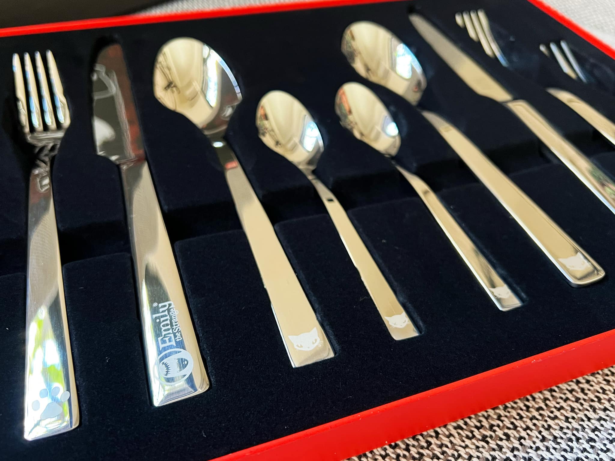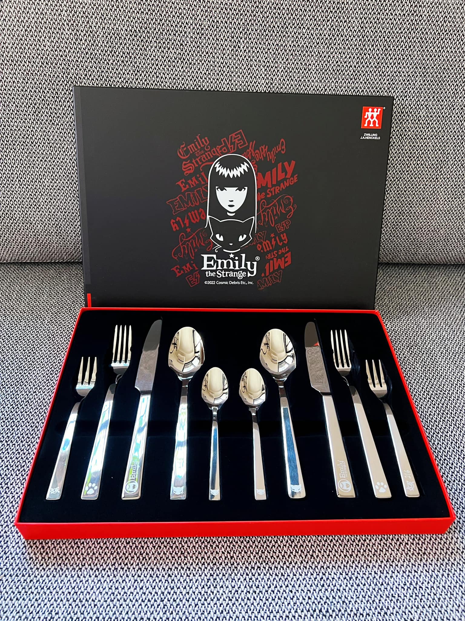 它們是美國黑馬漫畫旗下的EMILY THE STRANGE,黑、紅、白分明的色彩辨識度超高,仔細看每支刀叉的尾端都有不同的特色雷雕,更有獨特的編號,做為送給VIP的禮盒非常有面子,首波推出就完售了!