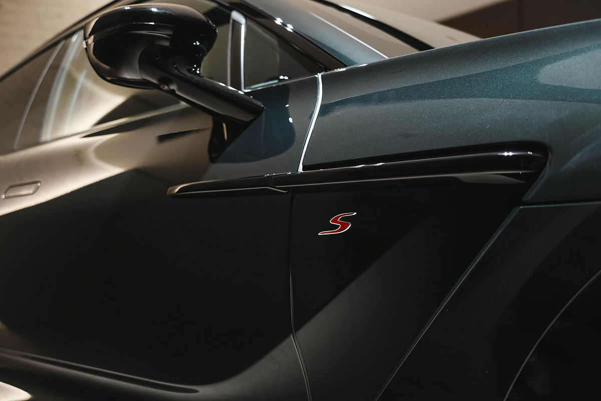 Alcantara材質點綴於中控台、車門與座椅,輕量化之餘更營造賽道氛圍,並於座椅外緣結合頂級真皮,兼顧奢華質感與日常使用的耐久性。客戶亦可選配全車頂級真皮內裝與紅色安全帶,進一步強化「S」車型所蘊含的動感張力。