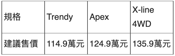 *X-line 4WD限定選配天窗:選配加價新台幣4萬元