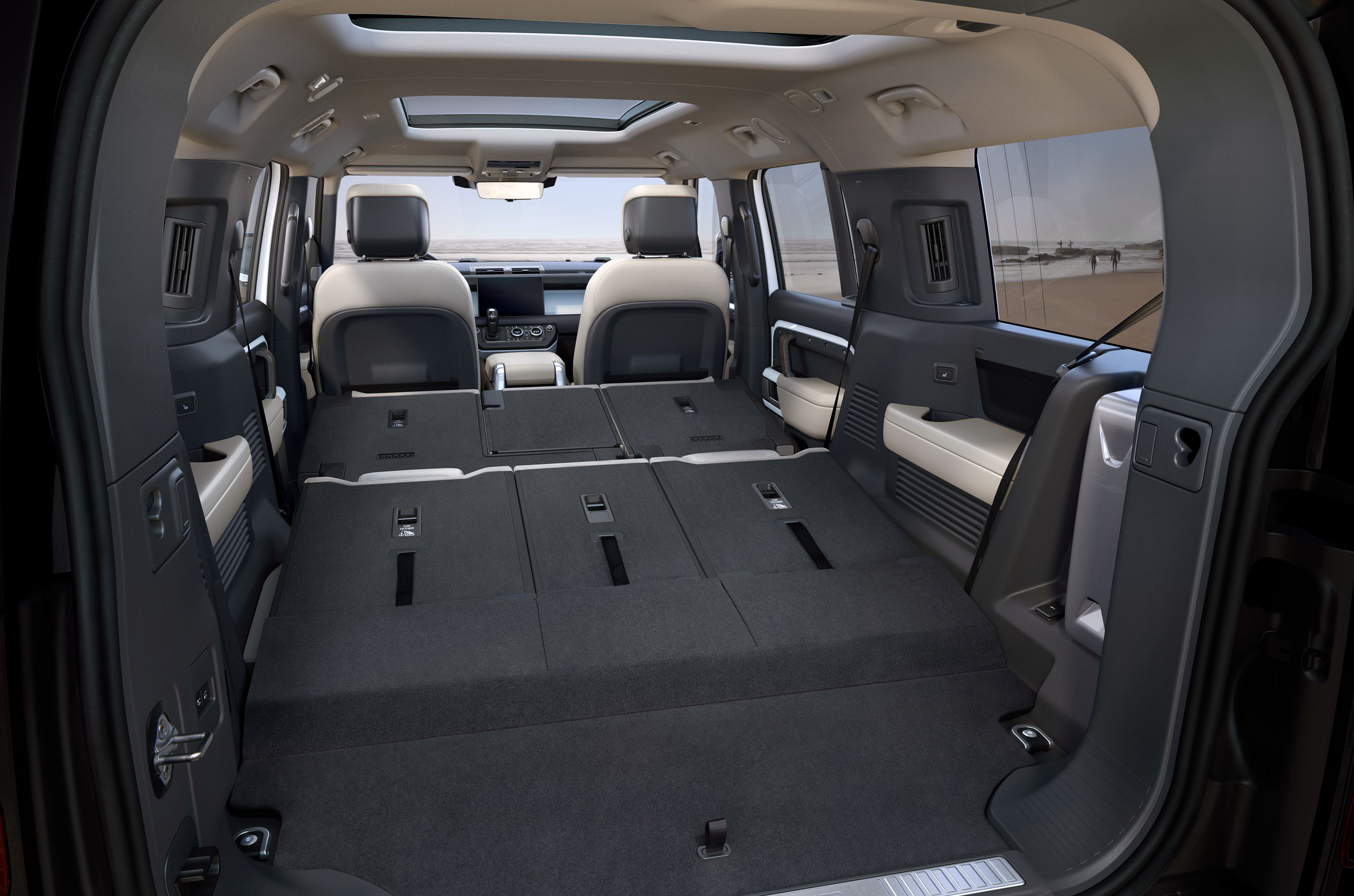 Land Rover 工程師透過在車體結構上重新配置內部空間,創造出令人驚豔的車室空間表現。向後延伸 340 mm 的車尾設計,Defender 130 軸距一舉增加至 3,022 mm,營造出毫不妥協的三排全尺寸配置。雙前座座椅具備 14 向電動調整、記憶與通風加熱功能,第二、三排亦具備加熱功能,包含第二、三排座椅具備四組 ISOFIX 兒童座椅套件;進出第三排時透過第二排座椅前、後滑動並向前折疊以提供寬敞的開口。雙後排座椅皆可透過 40:20:40 分離靈活調整,在全部收折的情況下可提供高達 1,876 升的巨大置物空間,即使在三排的配置下,置物容量也具備 290 升。座椅採用劇院式設計,結合更大面積的窗戶與車頂全景玻璃天窗和第三排上方固定式天窗,為車內的每位成員提供更為通透明亮的空間感受。
