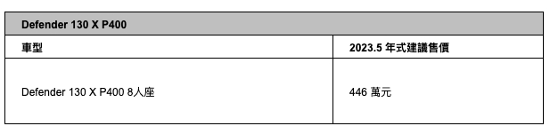 Defender 130 承襲 Defender 新世代家族設計,車身向後優雅延伸創造毫無妥協的寬敞車室空間,最多可承載最多八名成人的舒適旅程;雙後排座椅皆可靈活調整,最多可創造高達 1,876 升的巨大置物空間。豐沛動力與新世代底盤科技結合,不因車長變化而有所妥協,成就全地形王者之姿。Defender 130 今(6)日正式上市,2023.5年式建議售價為 446 萬元起,並享 0 負擔 6 年原廠保養專案,更多購車資訊請洽全台授權經銷商。