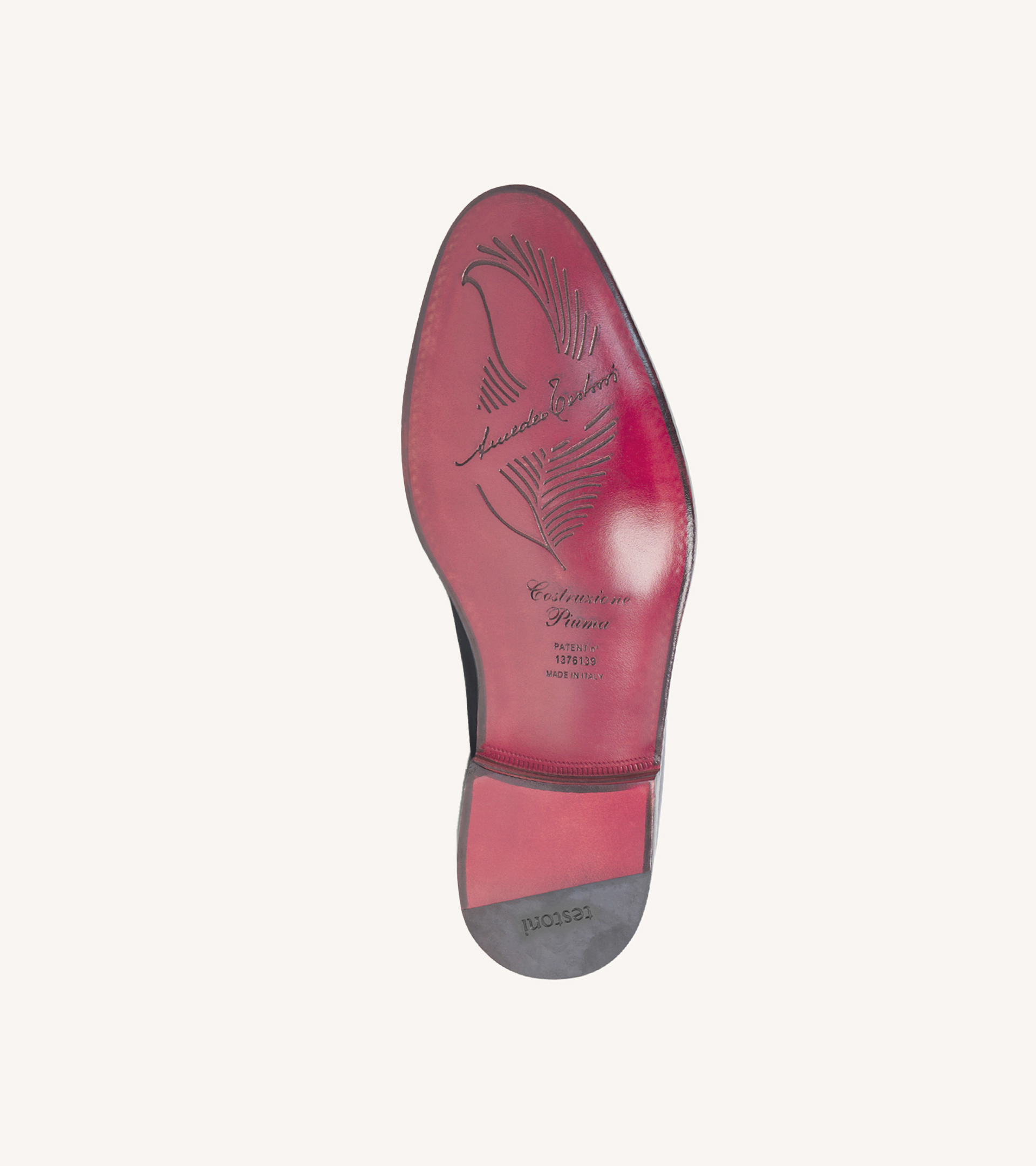 自1929年起,獨家專利的縫合工法Piuma Rapid便成為Testoni的品牌標誌。這項複雜的工藝需經超過200道以上的手工步驟才可以完成,展現品牌對於細節的講究與極致追求。此特殊擁有專利工藝的鞋款,採用酒紅色皮革鞋底上面壓印著羽毛標誌及Piuma Rapid專利編號,承諾著品牌為顧客打造一雙具有柔韌性、防水功能與舒適性的完美鞋履,並賦予雙腳最極致與舒適的穿著體驗。