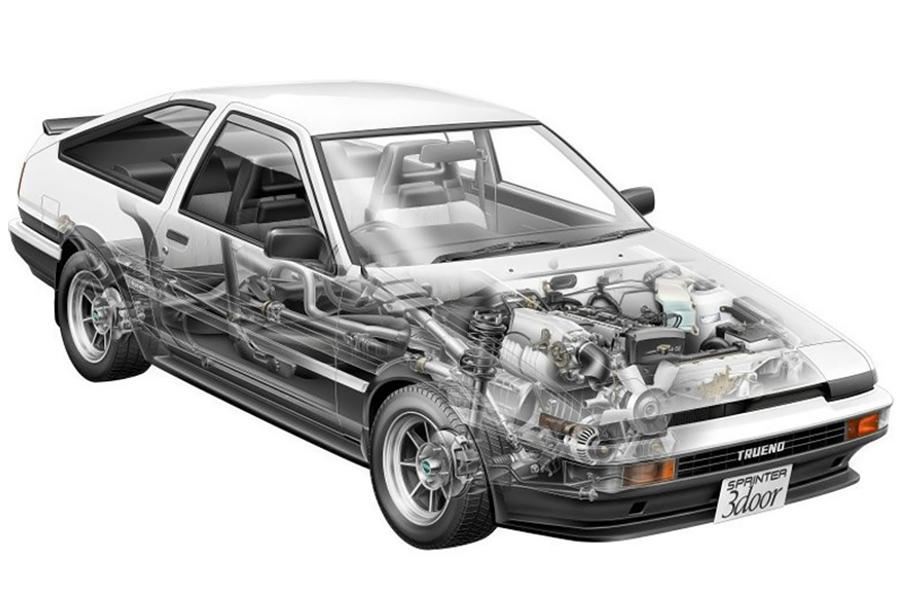 事實上與 Mazda RX7 及 Nissan GT-R 等具有純正運動血統的跑車相比,Toyota 旗下的這輛 AE86 顯然遜色了不少,當然“AE86”也並非這輛車的真實名稱,所謂的 AE86 不過是這輛車的底盤編號,其中 “A” 代表著這輛車所搭載的 Toyota 4A 系列引擎 ; “E” 與 “8” 則代表 Toyota Corolla 中的 E80 車系 ; “6” 則代表著第六款的改良版本。