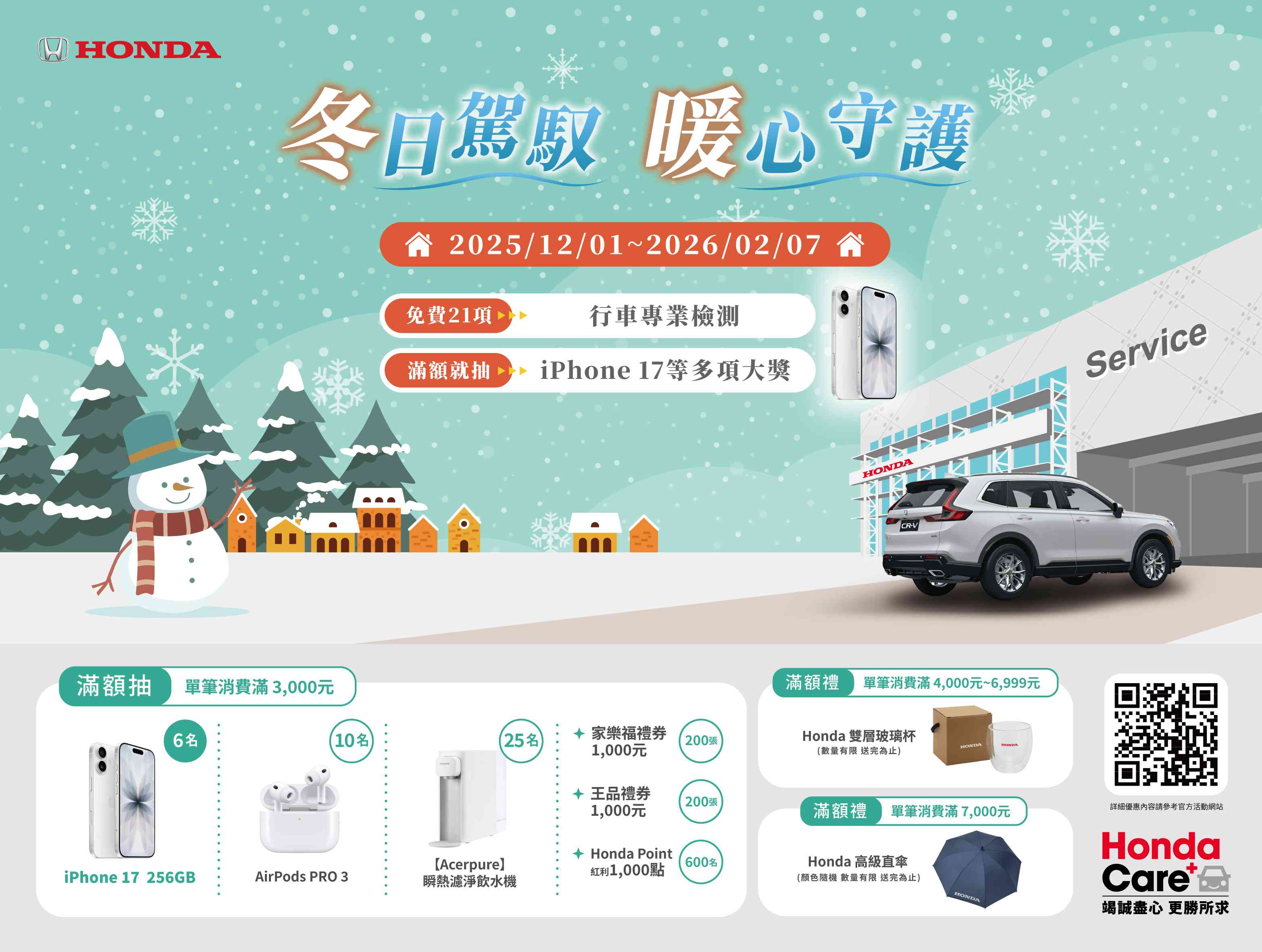 Honda Taiwan 自 2025 年 12 月 1 日起至 2026 年 2 月 7 日 舉辦 Honda Care+「冬日駕馭 暖心守護」冬季回廠活動。活動期間提供免費21項行車安全健檢、多項優惠套餐、消費滿額贈及滿額抽iPhone 17、AirPods PRO 3等多項大獎活動。敬邀全台車主預約回廠,安心迎接冬季用車時節。