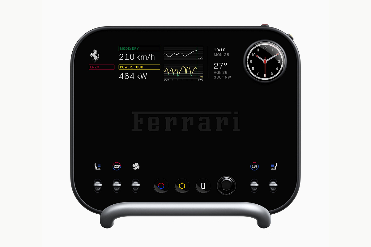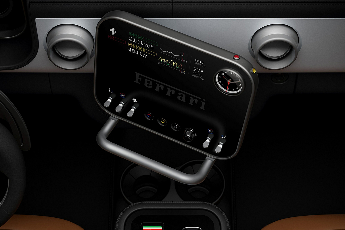 整合於中央顯示螢幕的多功能顯示儀(Multigraph),堪稱微工程領域的典範之作。這塊象徵精確與創新的顯示儀,搭載專利機芯,由三枚獨立馬達驅動指針自主運轉。三根陽極氧化鋁指針在極簡風格的錶盤上平滑掠過,錶盤上方則覆以 Corning® Fusion5® 玻璃罩。藉助先進的電子控制系統,該顯示儀提供四種模式:時鐘、計時碼錶、指南針及彈射起步(Launch Control)。模式切換間的動態過渡效果,令人聯想起高級機械計時腕錶的精密質感。整體設計不僅向 Ferrari 的歷史傳承致敬,同時透過融合製錶工藝與前沿科技,重新定義駕乘體驗,淋漓詮釋了躍馬品牌對激情與卓越的不懈追求。