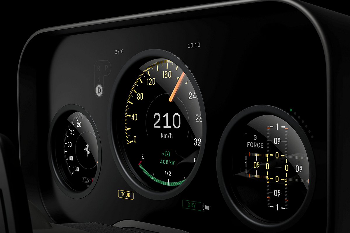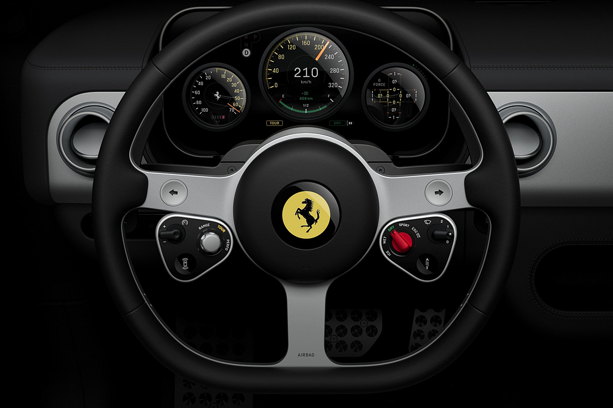 儀錶板與方向盤轉動時同步轉向,不僅優化了駕駛者讀取資訊的視野,更提升了駕駛專注度與操控表現。這也是 Ferrari 首次在量產車型中採用整合於轉向柱上的儀錶板。該儀錶板採用兩塊重疊式 OLED 顯示螢幕,憑藉清晰畫質、鮮明色彩與極致對比度,帶來前所未有的視覺體驗。整個儀錶板將數位與實體元素整合於一個獨立模組並固定於轉向機柱上,可隨方向盤的傾斜角度調整與前後伸縮同步移動。