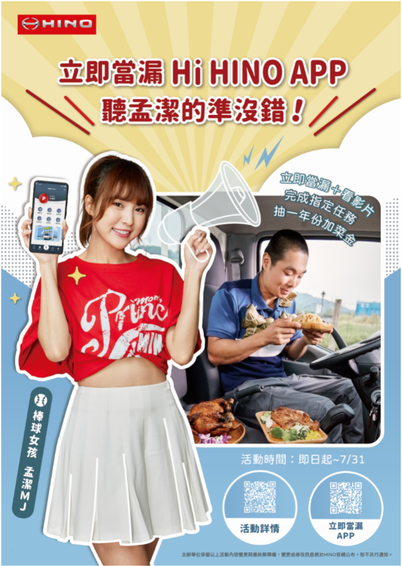 慶祝APP開台,HINO商用車請到棒球女孩孟潔化身Hi HINO小精靈,詳盡介紹APP功能的同時也為大家加油打氣。即日起至7/31止只要完成指定小任務,就有機會抽中1年份加菜金(和泰Points 10,000點),共計5名幸運兒。