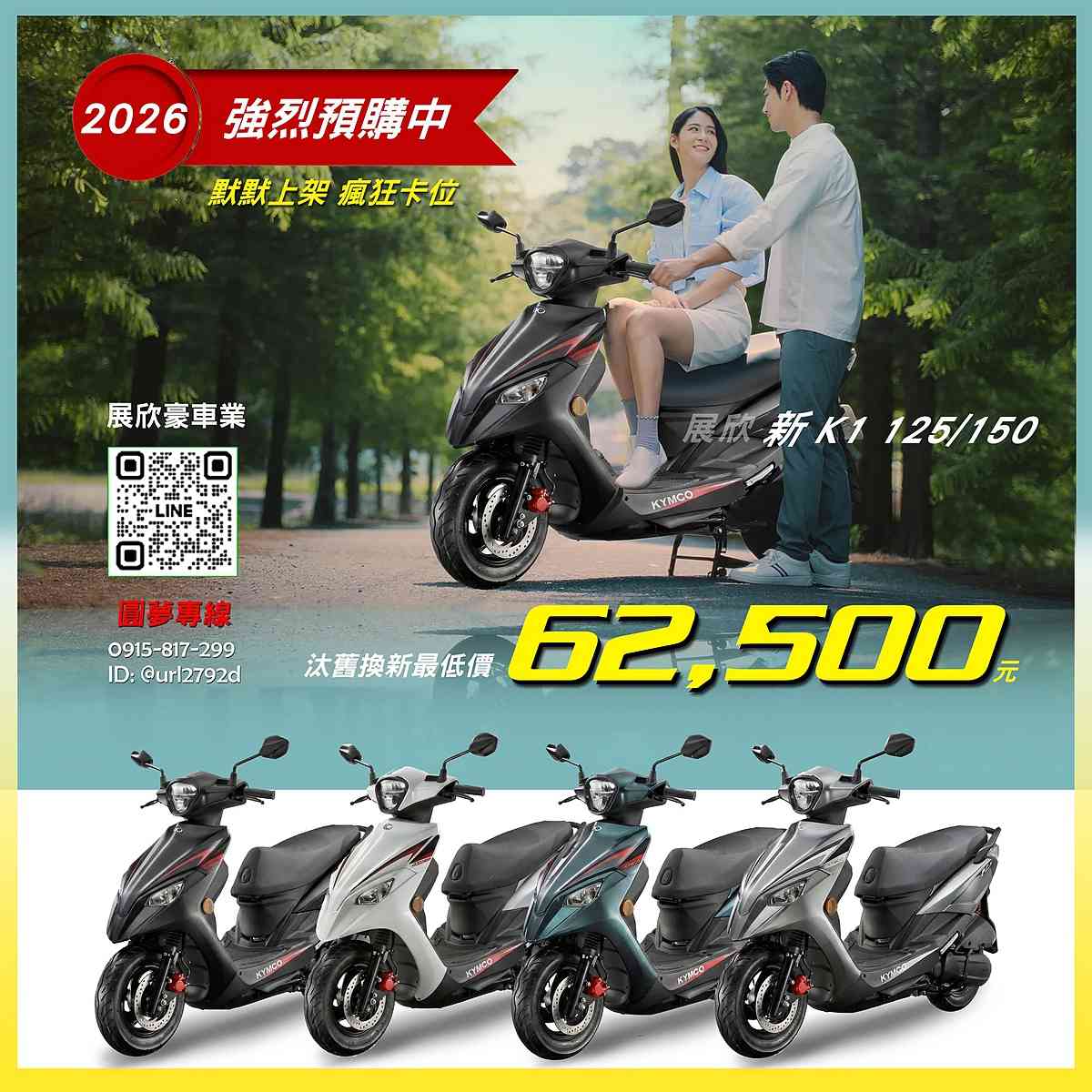 最驚人的是依據經銷商透露,KYMCO光陽新K1特仕版不僅已經開始接單預定,更傳出採取125c.c.、150c.c.雙動力、同價格的震撼市場銷售策略,結合購車金與政府舊換新、貨物稅政策,KYMCO光陽新K1特仕版最低價只要新台幣62,500元。