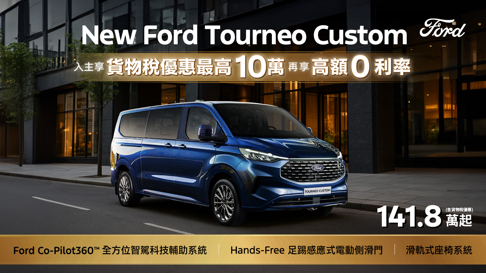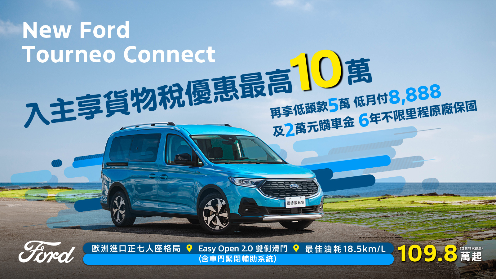 歐洲進口正七人座New Ford Tourneo Connect福特旅玩家,享貨物稅優惠價109.8萬起,再享低頭款5萬、低月付8,888、2萬元購車金及6年原廠保固〔註四〕;歐洲首選國際商旅New Ford Tourneo Custom福特旅行家,享貨物稅優惠價141.8萬元起,入主再享高額0利率。