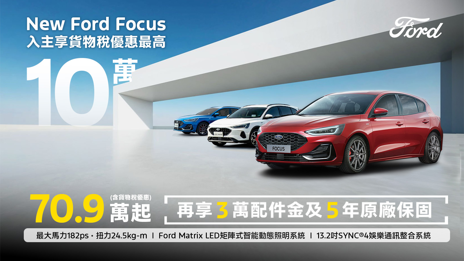 ※ Ford指定車款享貨物稅減徵最高10萬元,係指New Ford Focus國產全車系、New Ford Tourneo Connect福特旅玩家全車系、New Ford Tourneo Custom福特旅行家全車系,享新制貨物稅減徵優惠,最高補助10萬元。