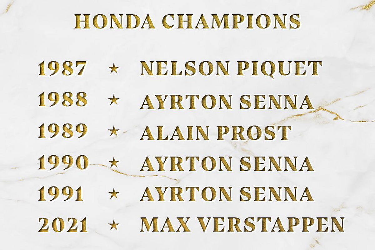 Honda Racing Corporation在F1一級方程式賽事的高光時刻,則是在2021年Red Bull Racing車手Max Verstappen奪下當年賽季車手冠軍,也替Honda睽違30年來重新進入F1一級方程式賽事的首個冠軍頭銜,隔年也順利拿下車廠、車手的雙料冠軍。