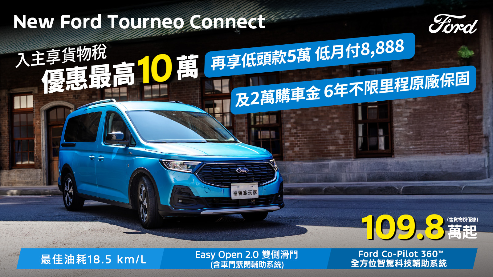 - Ford指定車款享貨物稅減徵最高10萬元,係指New Ford Focus國產全車系、New Ford Tourneo Connect福特旅玩家全車系、The All-New Ford Tourneo Custom福特旅行家全車系,享新制貨物稅減徵優惠,最高補助10萬元。