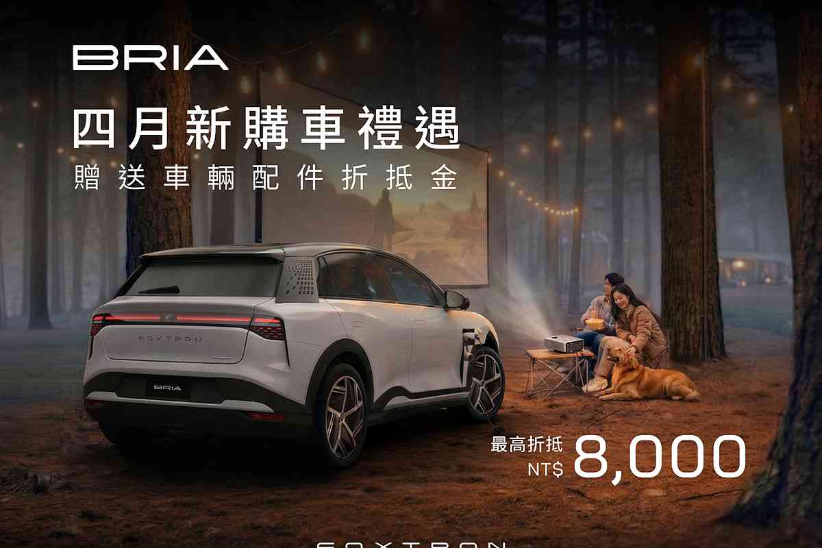 為讓廣大消費者能輕鬆體驗純電生活,FOXTRON於四月特別推出專屬購車禮遇。自2026年4月1日起至4月30日止,凡完成下訂BRIA Emerge或Pioneer車規,並於當月完成領牌之新車主,即可獲得最高8,000元的車輛配件折抵金,讓準車主們於購車當下即能自由選配實用配件,打造專屬座駕,完善個人化的移動需求。