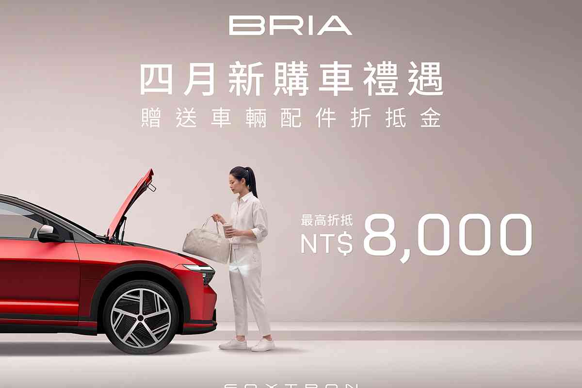 為感謝廣大消費者的熱烈支持與肯定,FOXTRON於4 月針對指定車型推出8,000元配件折抵金的新購車禮遇,讓車主能依個人需求輕鬆升級專屬個性化座駕;同時,為感謝首批入主BRIA的車主,指定車型將也將提供價值3,500元的保修服務抵用金,以實質回饋展現FOXTRON深耕台灣市場的決心與用心。