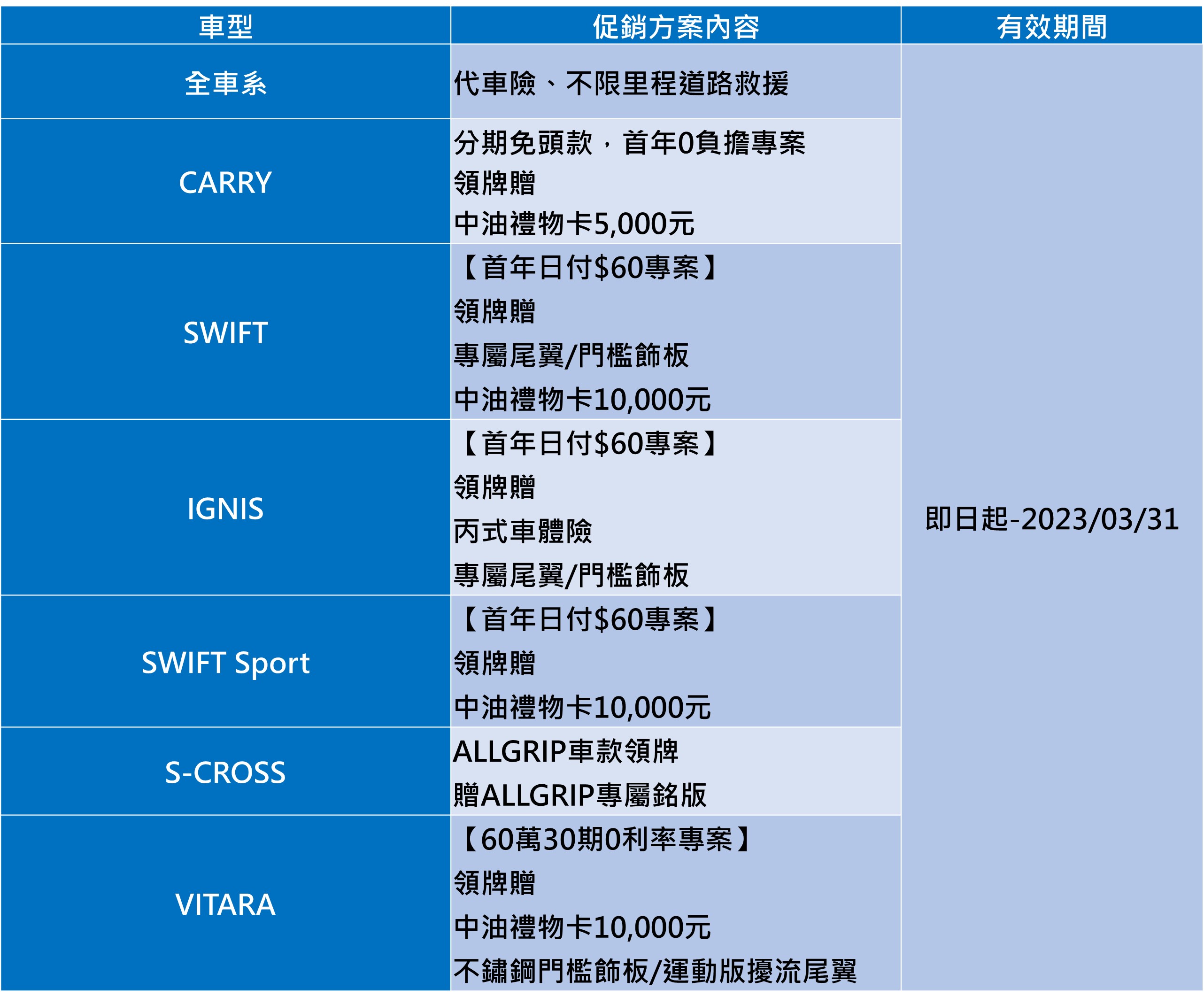 TAIWAN SUZUKI 秉持 GO UNIQUE 的品牌理念,持續推出兼具風格與駕馭樂趣的獨特車款。IGNIS不只外型亮眼,更多為女性設計的貼心細節:嬌小身材也有遼闊駕駛視野的高乘座位,將迴轉與停車變輕鬆的靈活操控,以及超繽紛的車色選擇等,讓每一位女性,都能盡情玩出想像力!為了讓更多人坐擁SUZUKI獨特魅力,TAIWAN SUZUKI 推出各車款多重好禮優惠:2023年起 SUZUKI 全車系HYBRID車款除可領政府汰舊換新補助金之外,還可再享空汙補助及減碳獎勵金7,000元;VITARA 及 SWIFT 車系領牌就贈「中油禮物卡10,000元」;IGNIS 領牌可享丙式車體險;豐富的購車優惠IGNIS 及 SWIFT 車系享「首年日付60元專案」,VITARA 車款享「60萬30期0利率」;全車系領牌可享『代車險』及『不限里程道路救援』。