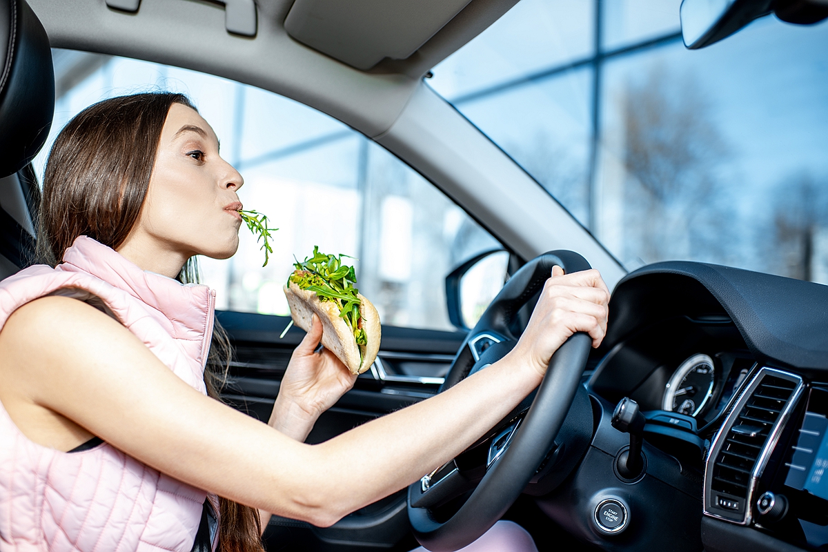 雞排、炸雞、小籠包、漢堡等都是台灣常見的食物,雖然只需要用一隻手就能進食,但要小心噴出來的湯汁、屑屑等都會導致駕駛分心,尤其是一隻手仍拿著食物,另外一隻手還要進行撿拾,就代表此時雙手都不再方向盤上了。